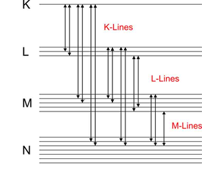 特征X射線光譜依據(jù)躍遷到不同的內(nèi)層軌道K層、L層、M層分別稱為K系、L系、M系特征X射線。特征X射線光譜中,特征線光子的能量等于躍遷的始態(tài)與終態(tài)能級間的能量差。